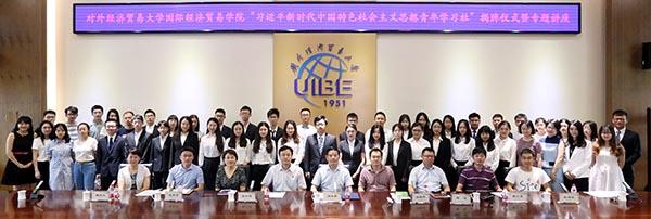 校新闻网讯(国际经济贸易学院供稿摄影玉君)6月29日,国际经济贸易学院“习近平新时代中国特色社会主义思想青年学习社”(简称学习社)揭牌仪式暨专题讲座在我校行政楼222举行。这是我校成立的首个“习近平新时代中国特色社会主义思想”学生理论社团。校党委书记蒋庆哲,党委办公室主任周波,宣传部部长张小锋,研工部副部长(主持工作)连英青,国际经济贸易学院副院长曹小勇、党委副书记曲佳文、领导团队成员裴建锁以及学院本研辅导员、学习社成员、部分学生党员代表等60余人出席揭牌仪式。国际经济贸易学院院长洪俊杰主持仪式。