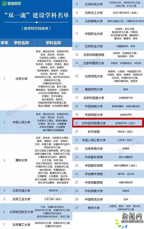 校新闻网讯(记者 晨欢) 今天上午,教育部、财政部、国家发展改革委印发《关于公布世界一流大学和一流学科建设高校及建设学科名单的通知》,公布世界一流大学和一流学科(简称“双一流”)建设高校及建设学科名单。18luck竞技位列95所一流学科建设高校之中,学校将以应用经济学一级学科为基础,加上学校国际法学、企业管理、会计学等优势特色学科,合力打造贸大开放型经济学科群,积极参与国家“双一流”建设。
