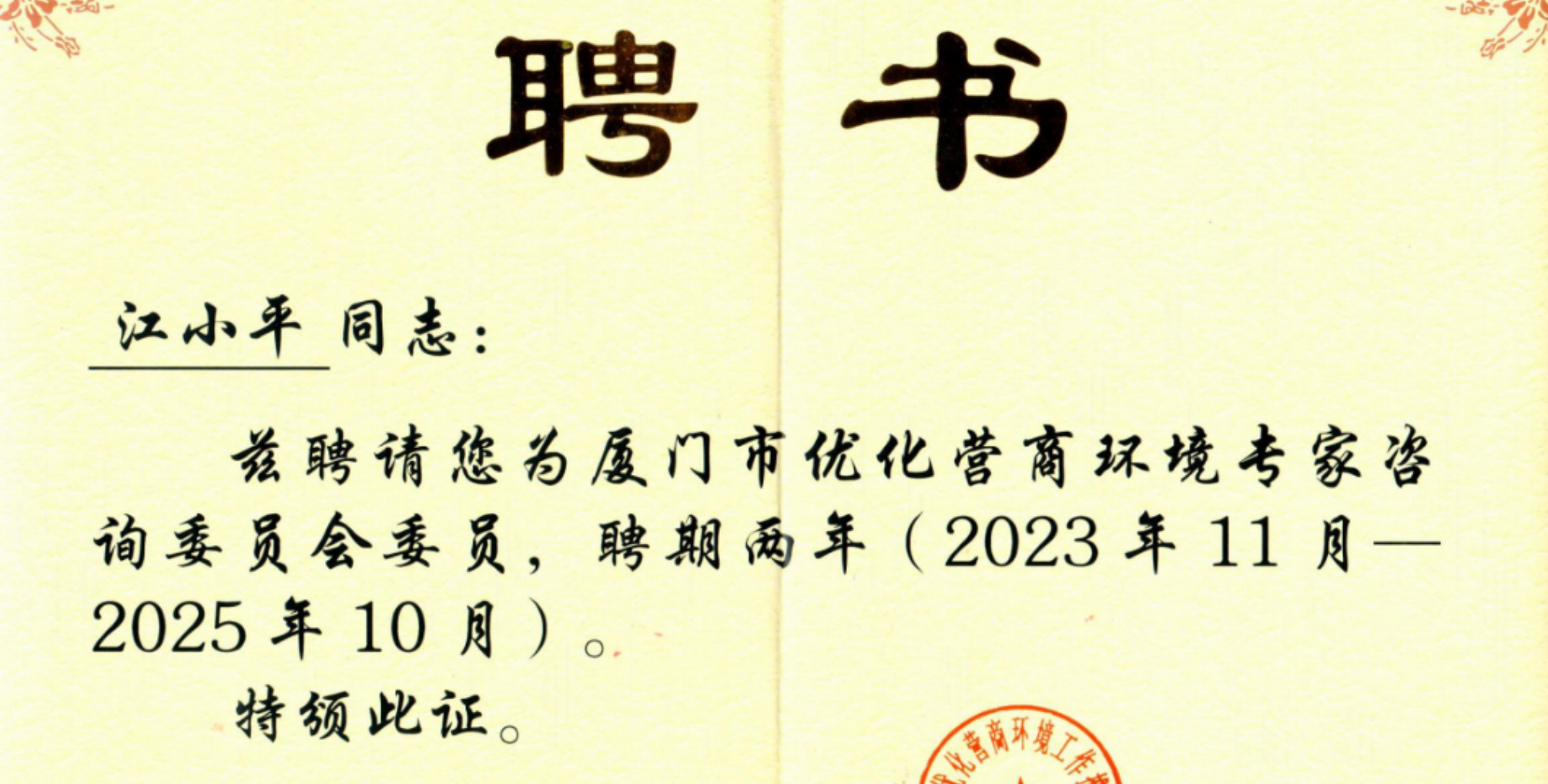 校友动态|江小平被聘请为“厦门市优化营商环境专家咨询委员会委员”